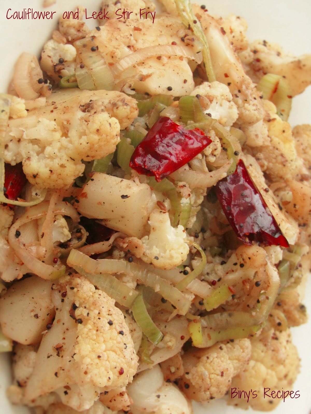 Heat oil in a pan and splutter the mustard seeds. Stir fry the red chillies and leek. Grind the cumin seeds, peppercorns and garlic together. Add the ground spice mix and salt to the leek. Roast it for a minute and then add the cauliflower florets. Allow the spices to coat the florets and cook for 3 to 4 minutes on a medium flame.